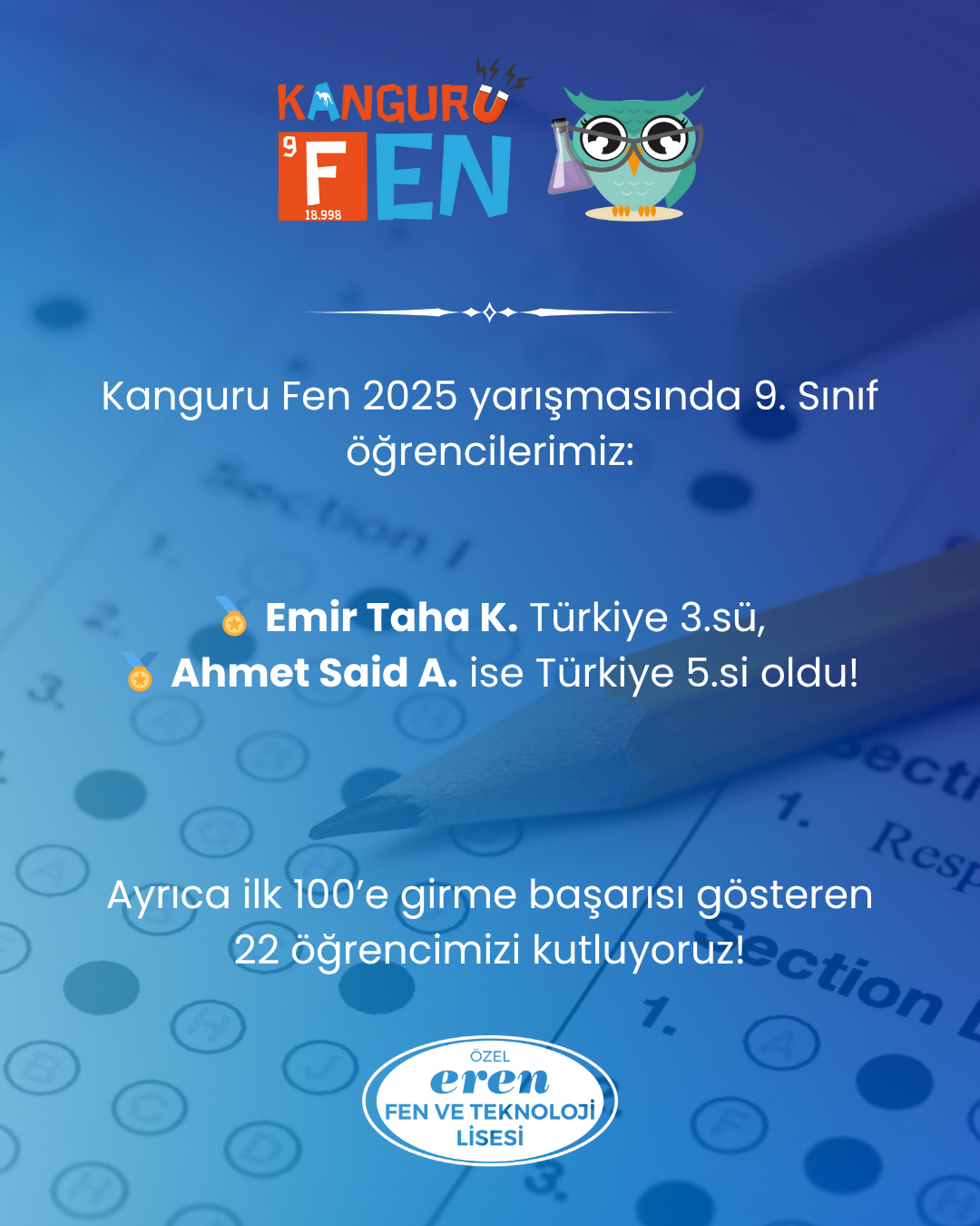 Yüzlerce öğrencinin katılımıyla gerçekleşen Kanguru Fen, öğrencilerin fizik, kimya, biyoloji ve bilimsel düşünme alanlarındaki becerilerini ölçen ulusal düzeyde prestijli bir yarışmadır. Ezber değil, anlamaya ve düşünmeye dayalı yapısıyla öğrencilerin fen okuryazarlığını desteklemektedir. Öğrencilerimizi bu kıymetli başarılarından dolayı tebrik eder, emeği geçen tüm öğretmenlerimize teşekkür ederiz.